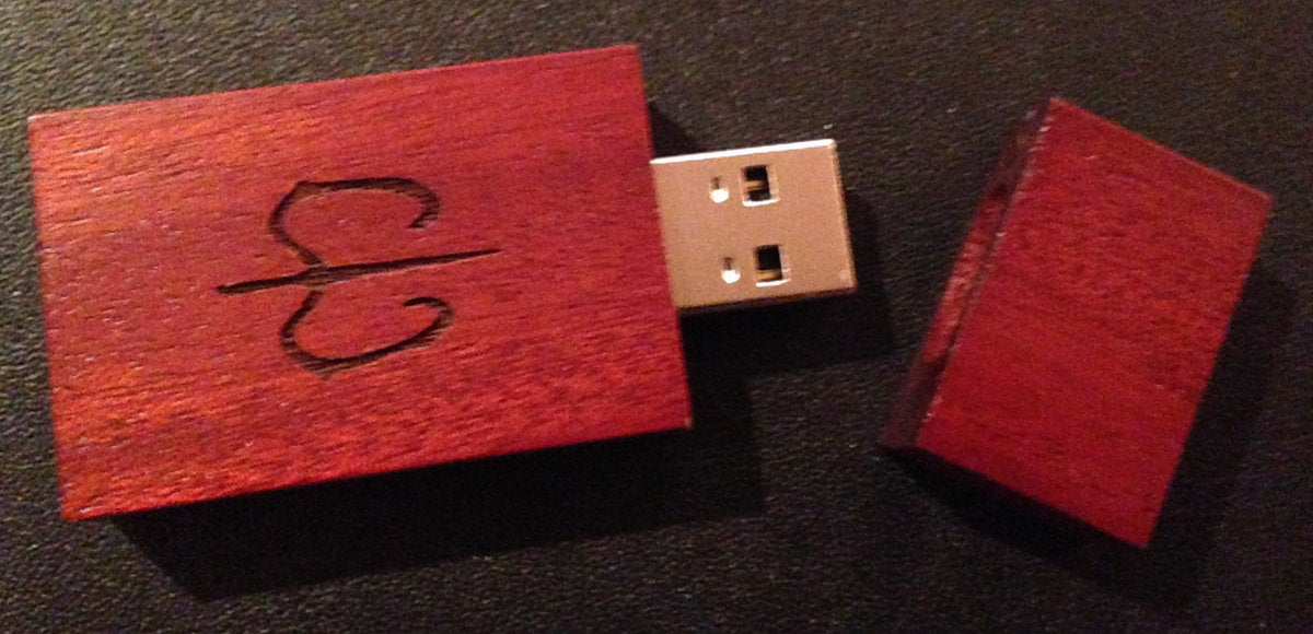 This elegant red wood 8 GB flash drive bears a laser engraved Evolutionaries logo and magnetic locking clasps. On the flash drive you will find