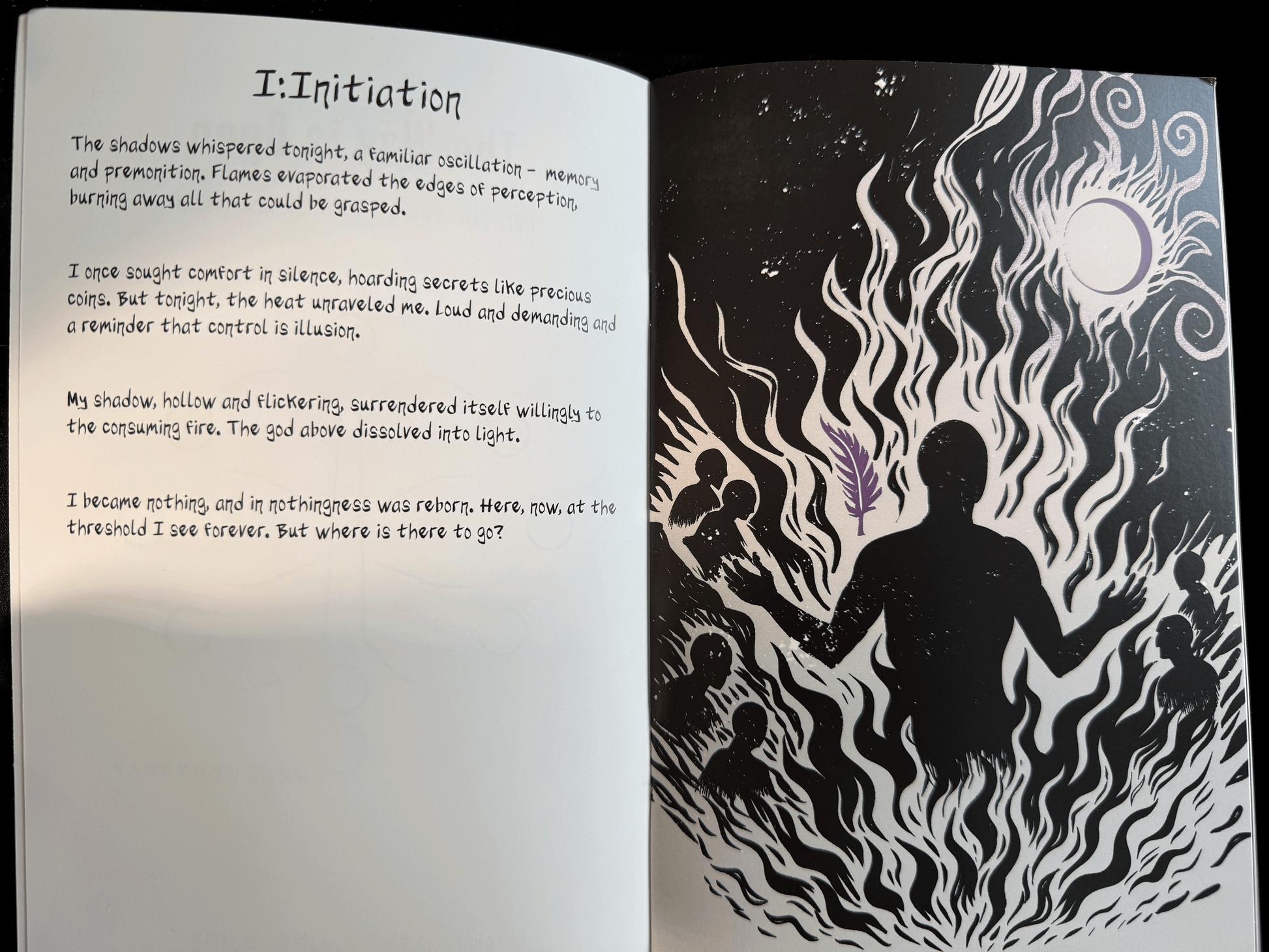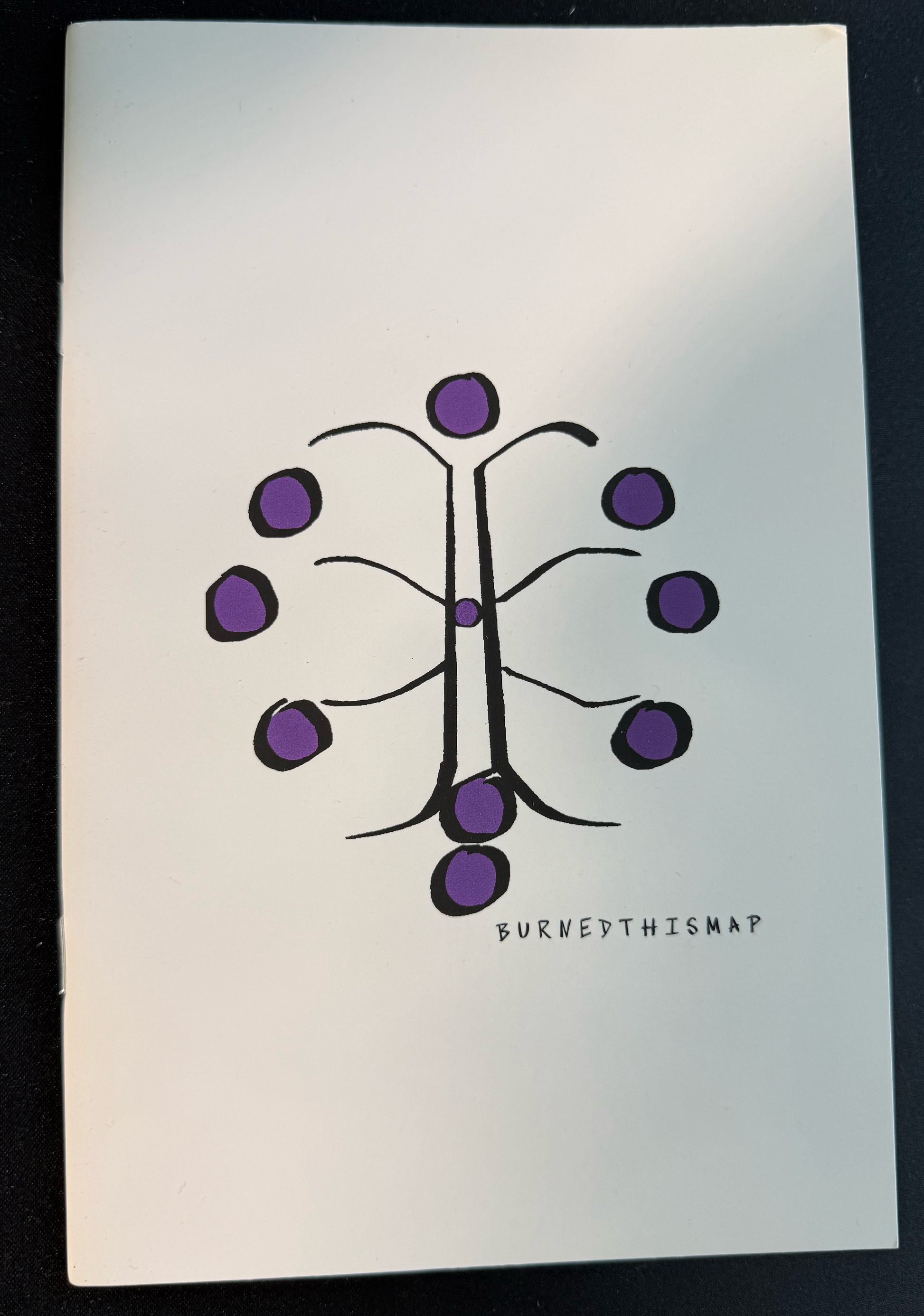 Printed on heavy, magazine-grade paper with rich black-and-white-and-purple artwork, the zine feels like an artifact from another place: compact, beautifully produced, and meant to be returned to as the songs reveal new meanings.